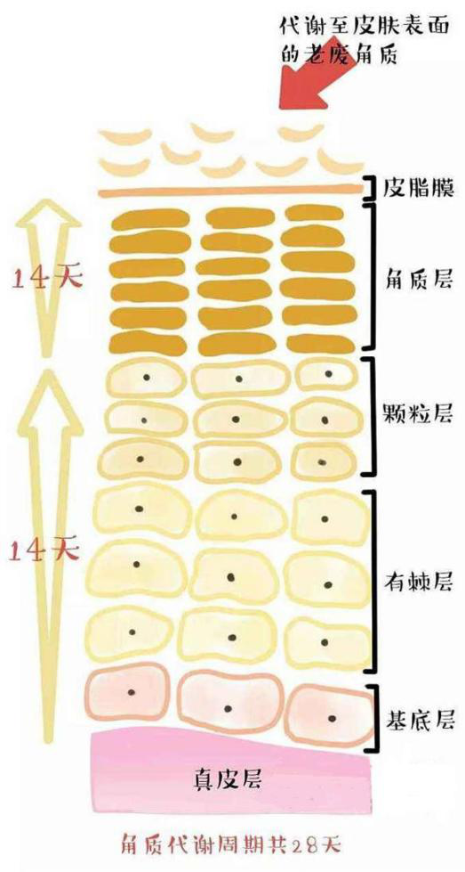 表皮细胞代谢周期约为28-30天。表层角质细胞脱落→信号传递至基底层→基底层新细胞再生。只有人体新陈代谢处于较高水平,才能让皮肤角质层细胞及时脱落。如果,皮肤的新生代谢速度减慢,表层角质会厚厚地堆积在皮肤表面,造成皮肤的老化及各种问题。原来细腻光滑的肌肤变得粗糙、黯淡无光。