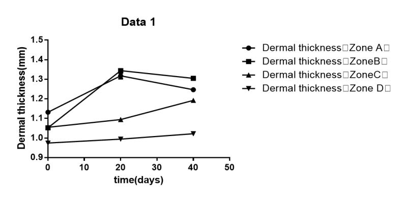 上海九院通过“扩张器皮瓣增厚术联合生物酶外用对真皮厚度影响”的临观,经过对比,术后40天真皮厚度增加约10%。真皮再生更快趋于平衡。